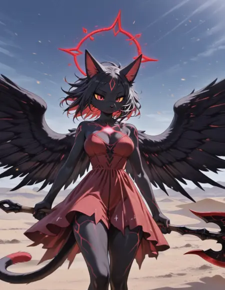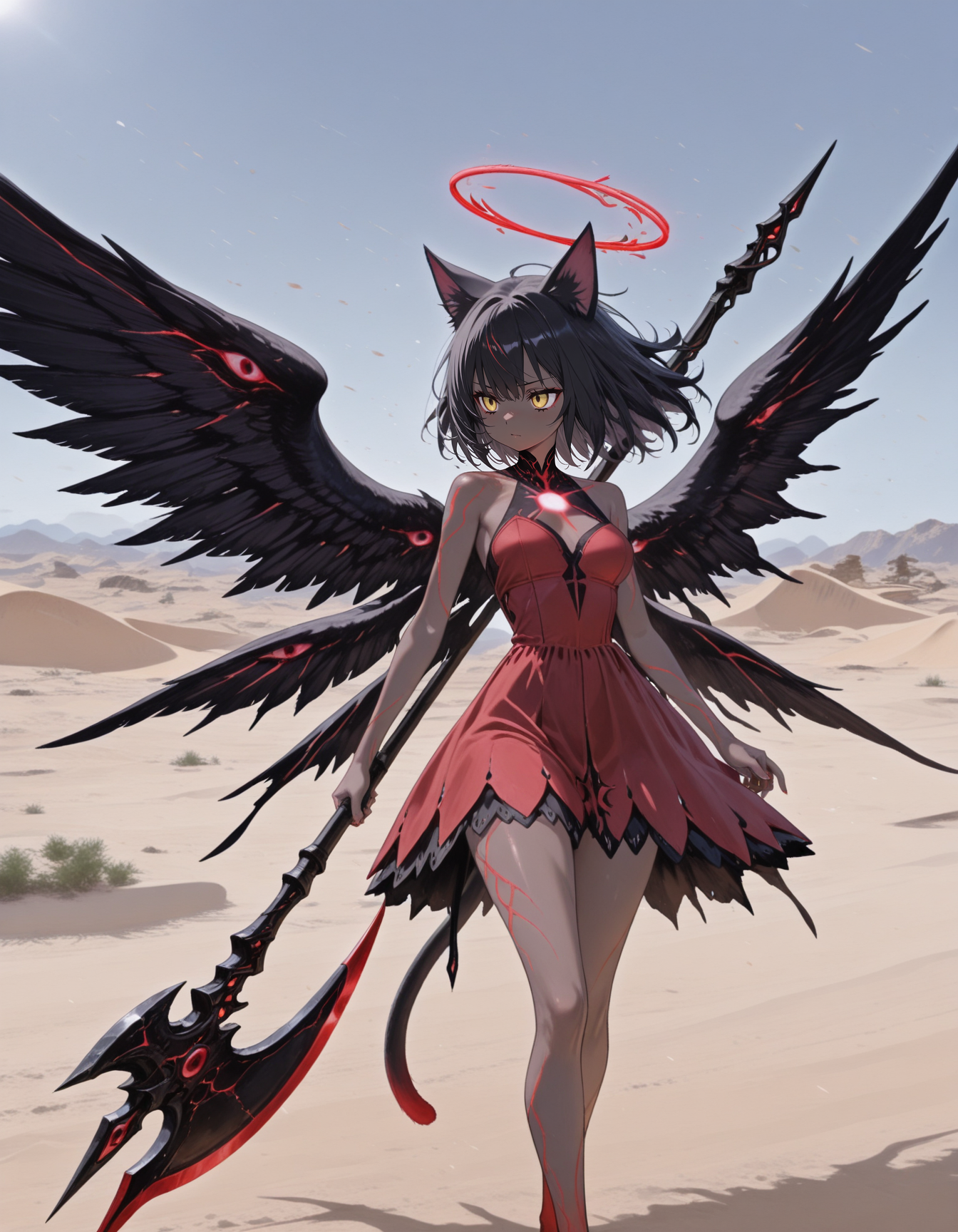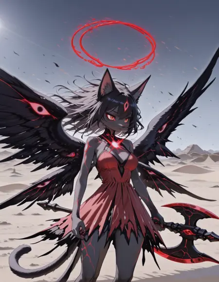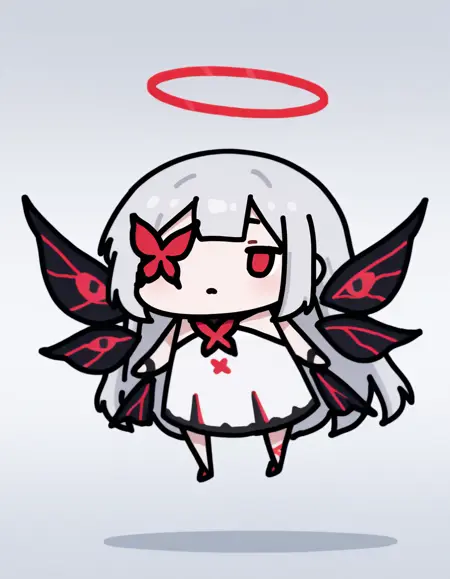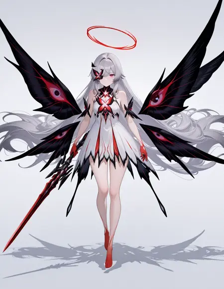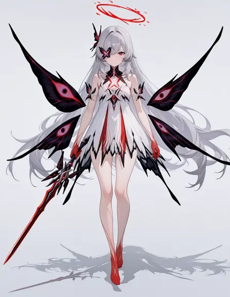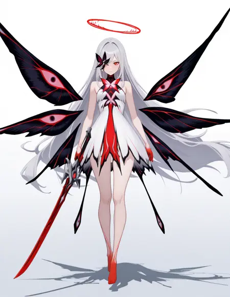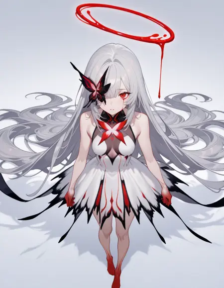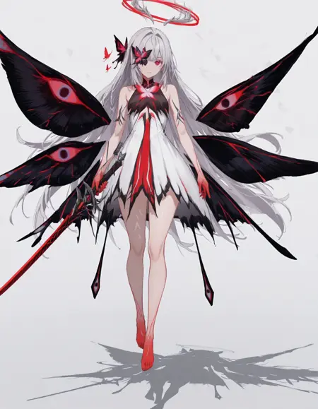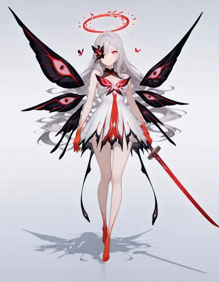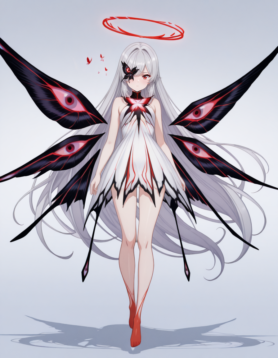 maipgrchaos,very_long_hair,red_eyes,bare_shoulders,grey_hair,sidelocks,butterfly_over_eye,white_dress,floating,multiple_wings,barefoot,no halo,red halo,holding_sword