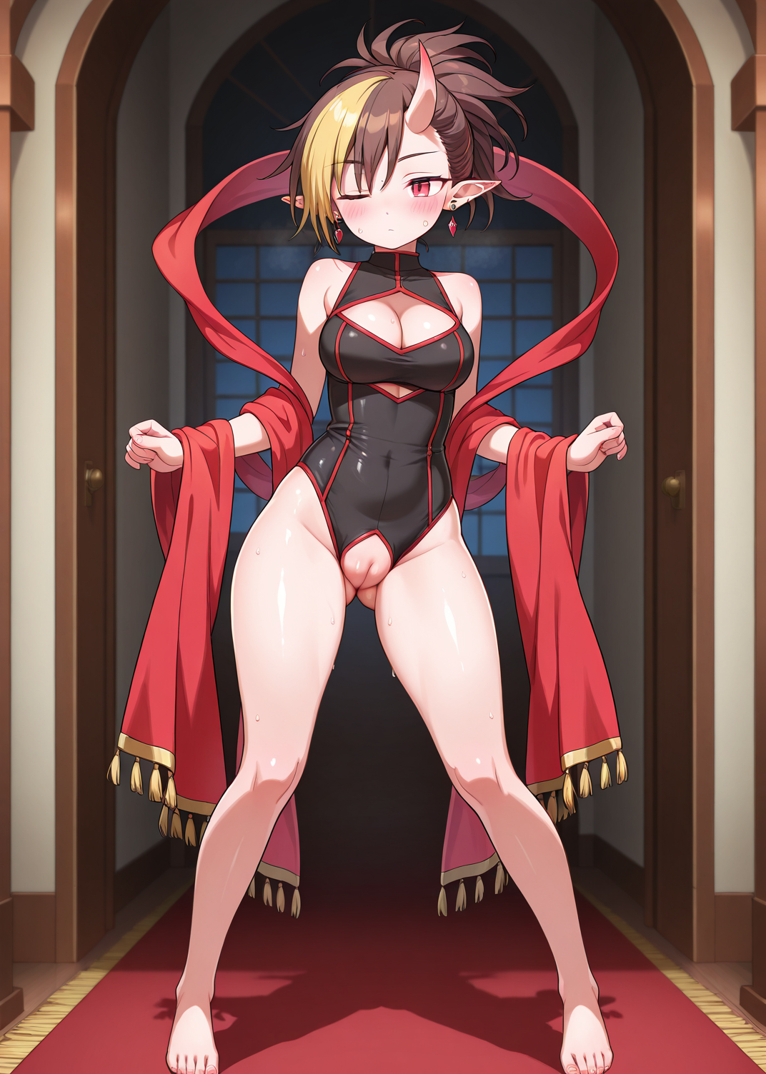 Sheera, sheera, oni, demon, red eye, pointed ears, 1horn, earring, 1girl, solo, horns, pointy ears, one eye closed, jewelry, blonde hair, breasts, red eyes, earrings, cleavage, single horn, multicolored hair, cleavage cutout, two-tone hair, clothing cutout, brown hair, blush, medium breasts, shawl