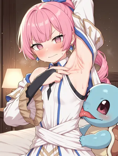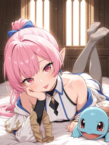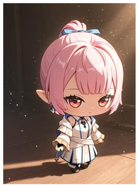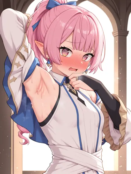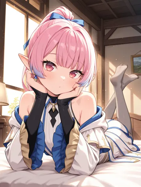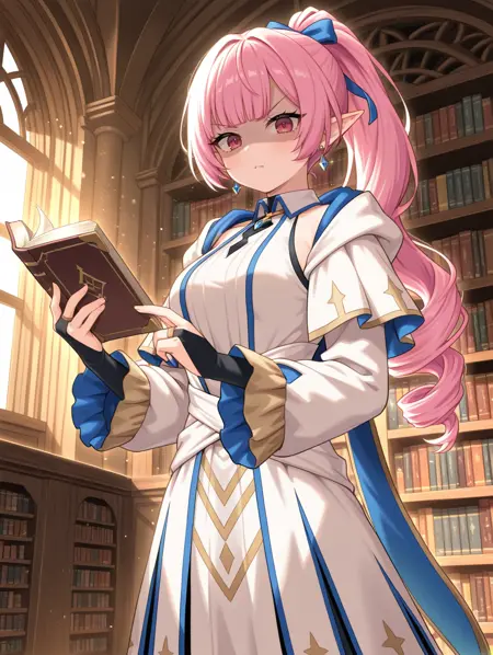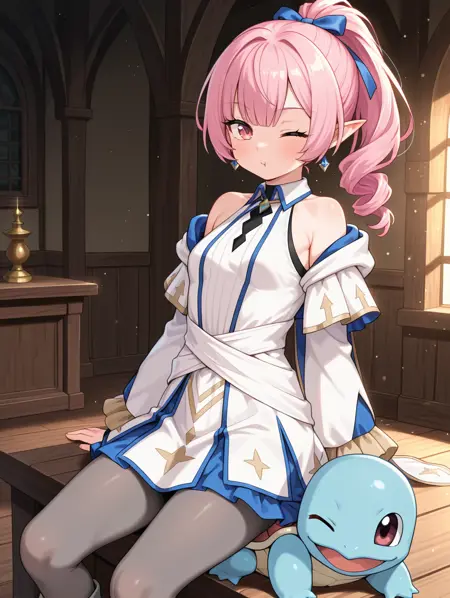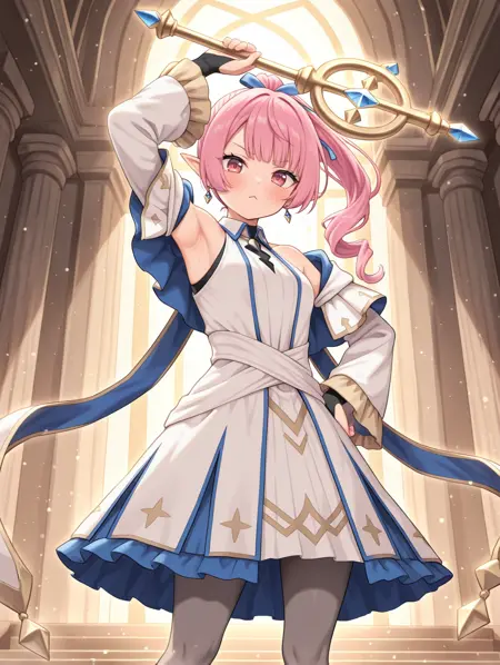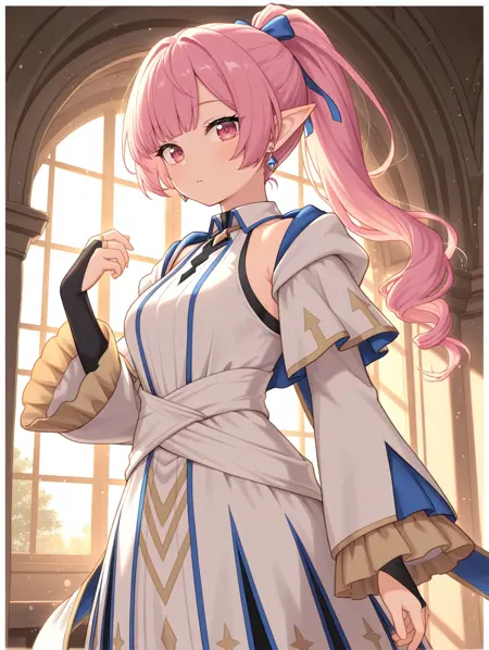 Tags (clothes): blue ribbon, blue earrings, hair ribbon, white capelet, white sleeveless dress, black bodysuit, white frilled sleeves, black bridal gauntlets, grey pantyhose, brown knee boots,
