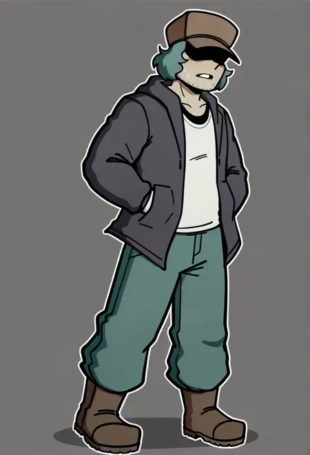 GarcelloFNFHR, 1boy, teal hair, brown hat over eyes, brown eyes, grey-black jacket hoodie, plain white t-shirt, teal pants, brown boots, white fingerless gloves, teal stubble