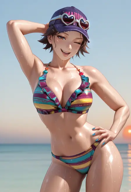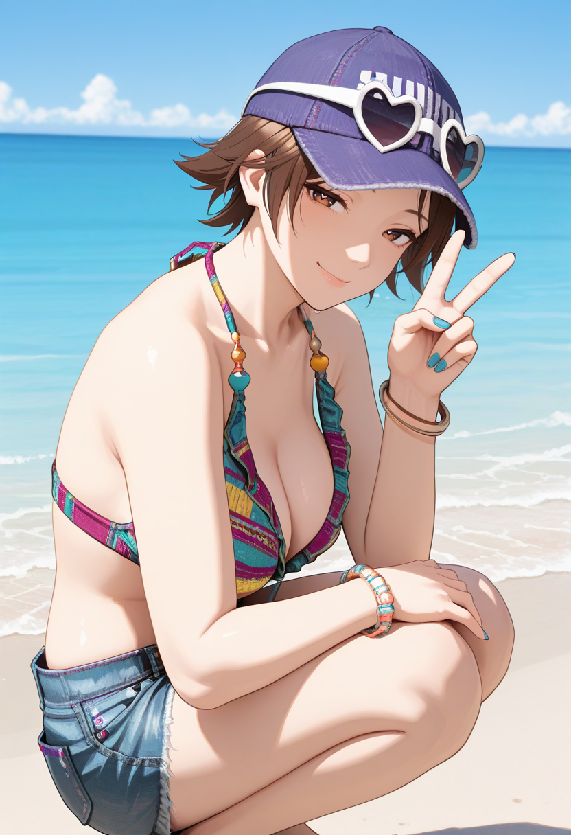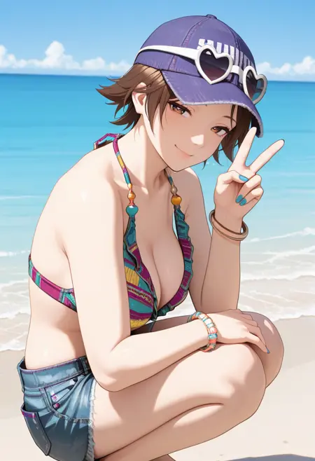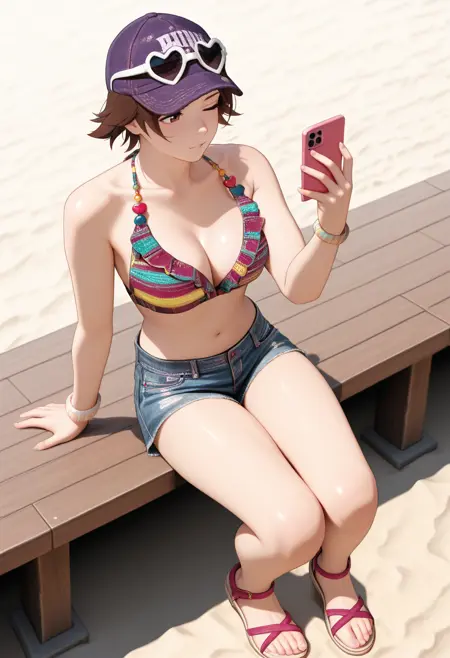 "M1HIRTK,棒球帽,心形眼镜,眼镜戴在帽子上,棕色头发,短发,多彩比基尼,牛仔短裤,手链,蓝色指甲"