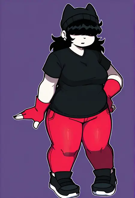 AnnieFNFHRM 1girl, pale skin, long black hair over eyes, red eyes, black t-shirt, red long legged pants, black shoes, long red fingerless gloves, black beanie with cat-like ears, chubby, white earrings