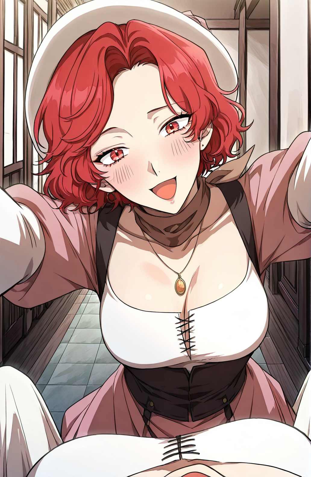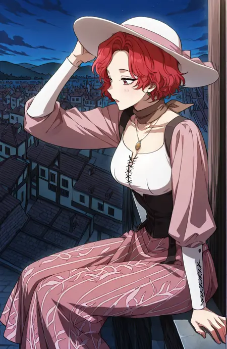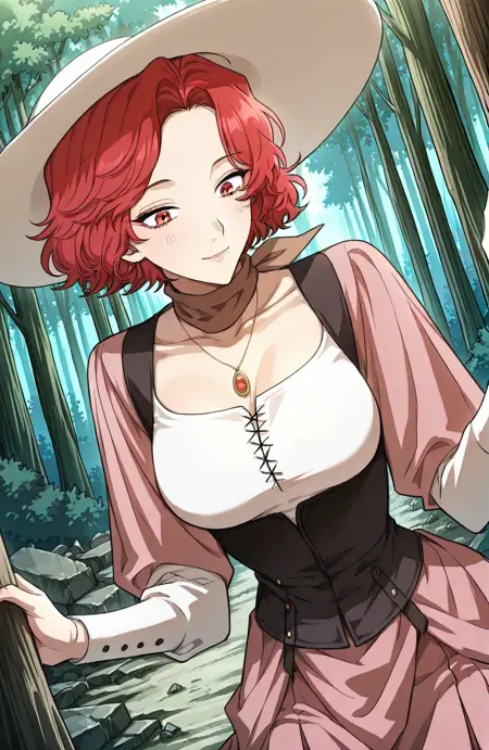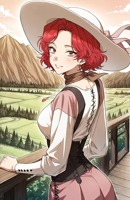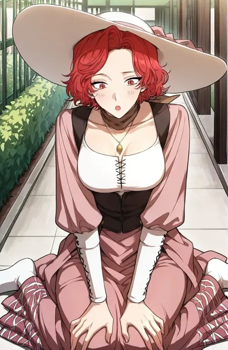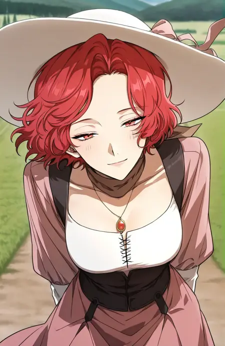 Keira, 1girl, short hair, wavy hair, red hair, parted bangs, short bangs, wavy bangs, red eyes, white wide-brim hat,