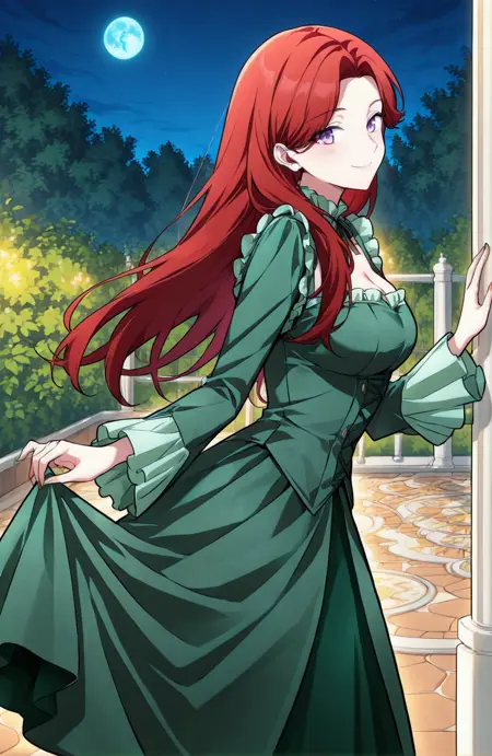 Isis_outfit, green dress, floor length dress, long sleeves, white frilled cuffs, white frilled shoulders, puffed sleeves, fitted bodice, cleavage,