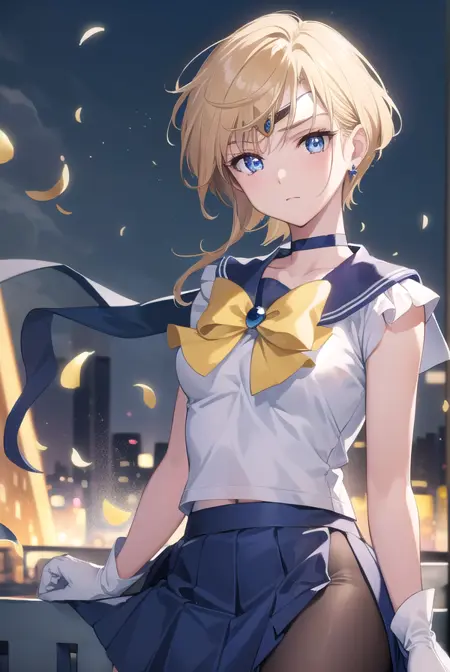 등쪽 리본, 파란 리본, 파란 목걸이, 파란 보석, 파란 해군 칼라, 파란 치마, 리본, 넥타이, 목걸이, 원형 헤어캡, 귀걸이, 팔꿈치 장갑, 보석, 장갑, 보석류, 미니스커트, 주름진 치마, 해군 칼라, 셔츠, 짧은 소매, 치마, 흰색 장갑, 흰색 셔츠, 노란 리본, 노란 넥타이,