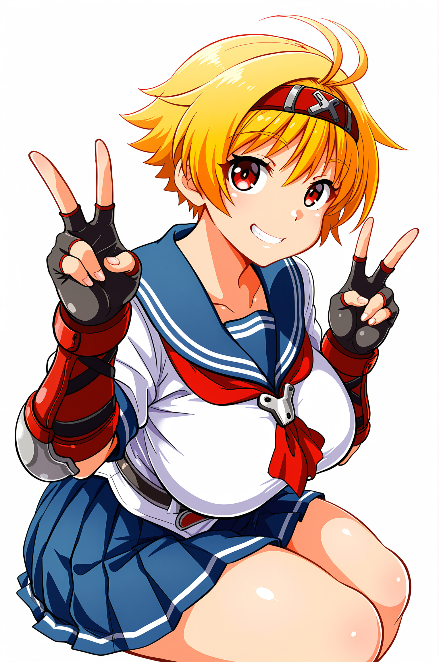 캐릭터: "KamikazeOuka, 안테나 머리카락, 단발, 금발, 큰 가슴, 헤어밴드, 붉은 눈, 헤드밴드, 굵은 허벅지"