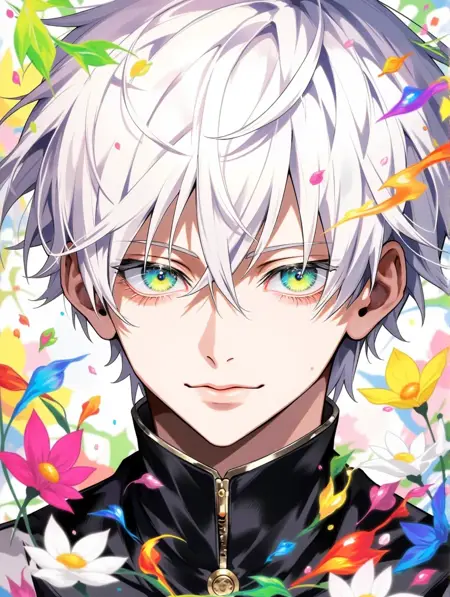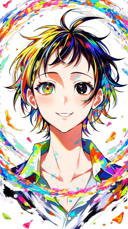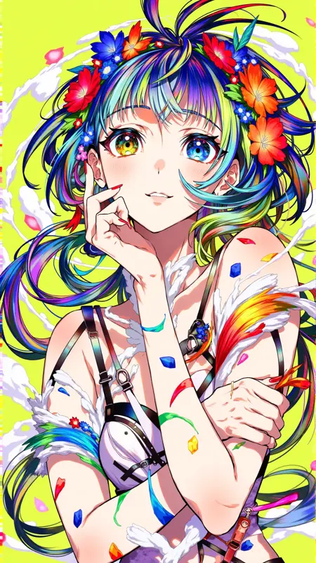 長い流れている多色の髪を持つ若い女性のアニメスタイルのデジタルイラスト。青、緑、紫の色調が含まれています。片方の目は青、もう片方は緑で、異色瞳です。鮮やかな赤、青、オレンジの花が飾られた花輪を髪に着けています。抽象的な形と模様が施されたカラフルなドレスを着ています。表情は穏やかで、やや melancholic です。背景は明るいライムグリーンで、抽象的で渦巻く模様が広がっています。アートスタイルは非常に詳細で、鮮やかな色と繊細なデザインに焦点を当てています。照明は明るく均一で、被写体を強調しています。