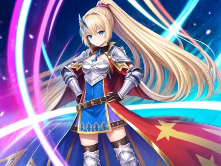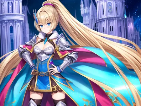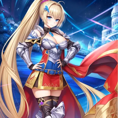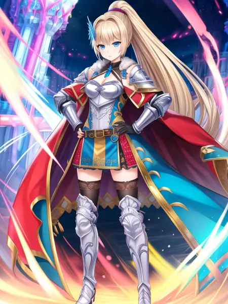 camelot,blonde hair, blue eyes, high ponytail, hair ornament,armor, zettai ryouiki, high heel boots,