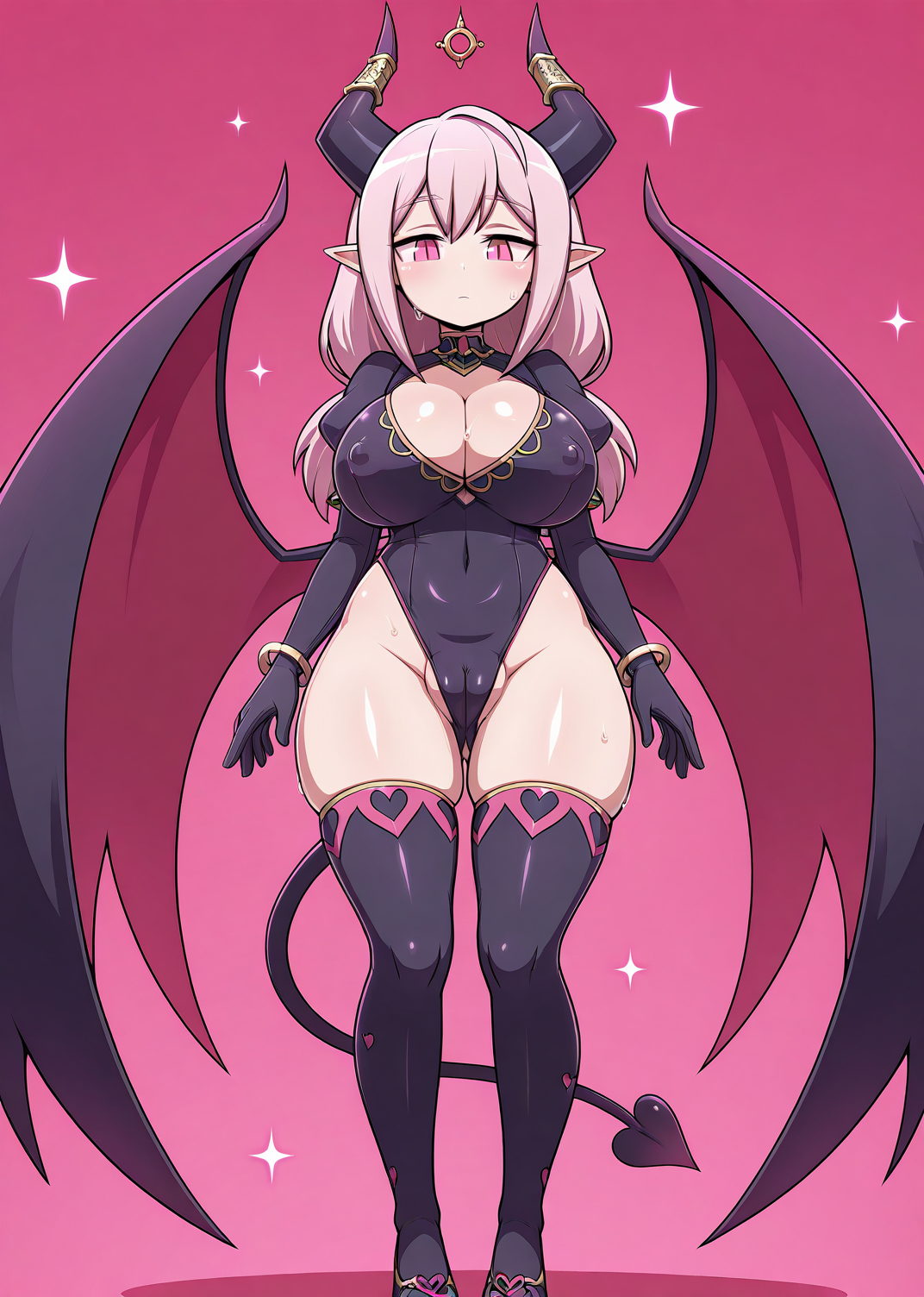 LewdSuccubus, lewdsuccubus, horns, demon horns, pink eyes, wings, 1girl, breasts, solo, wings, horns, thighhighs, pink hair, large breasts, tail, pointy ears, gloves, demon girl, long hair, leotard, cleavage, bracelet, pink eyes, closed mouth, demon wings, black gloves, jewelry, covered nipples, puffy sleeves