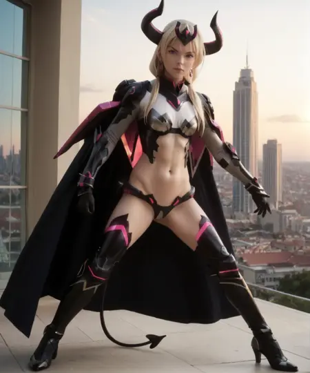 evilyisunaarmor, armor, horns, thighhighs, midriff, crotch plate, boots, knee boots, high heels, devil tail, gloves, claws, armored clothing
