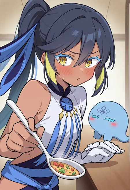 Nhi: 濃い肌、黒髪、多色の髪、黄色の髪、ポニーテール、青いリボン、色付きまつげ、青いまつげ、黄色の目、青い帯、青い生物、陣笠、ネックレス、非対称な服、非対称な腕装備