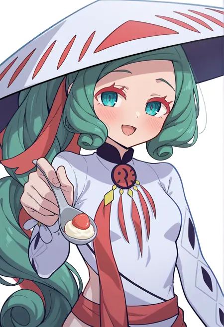 Trac: ポニーテール、カールした髪、多色の髪、緑の髪、緑の目、赤いリボン、色付きまつげ、赤いまつげ、ピンクの生物、陣笠、赤い帯、ネックレス、非対称な服、非対称な腕装備