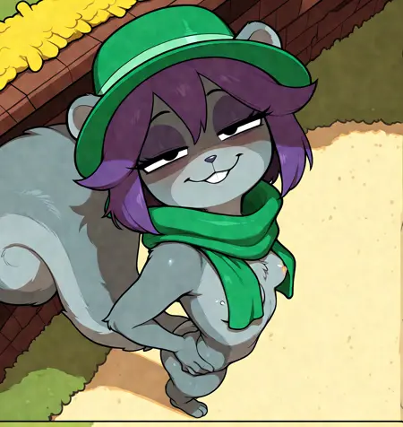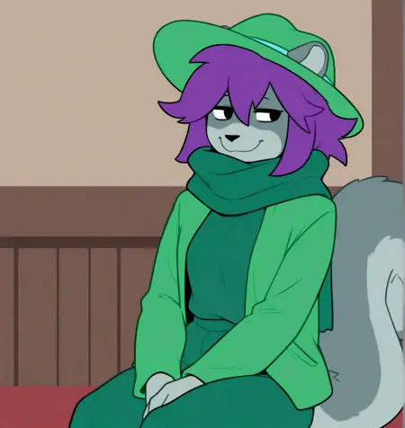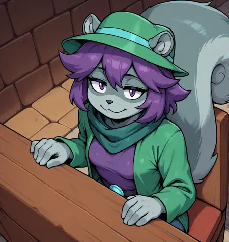 lora:Mooch\_Undertale\_Yellow:0.7, mooch (undertale yellow), grey squirrel, female, undertale, tree squirrel, undertale (series), anthro, purple hair, green hat, scarf, green scarf, neckerchief, clothed, clothing