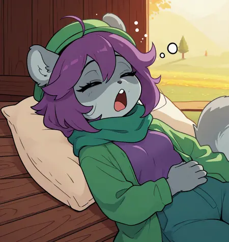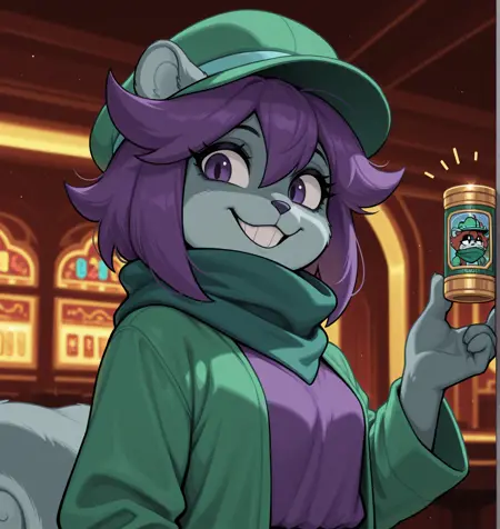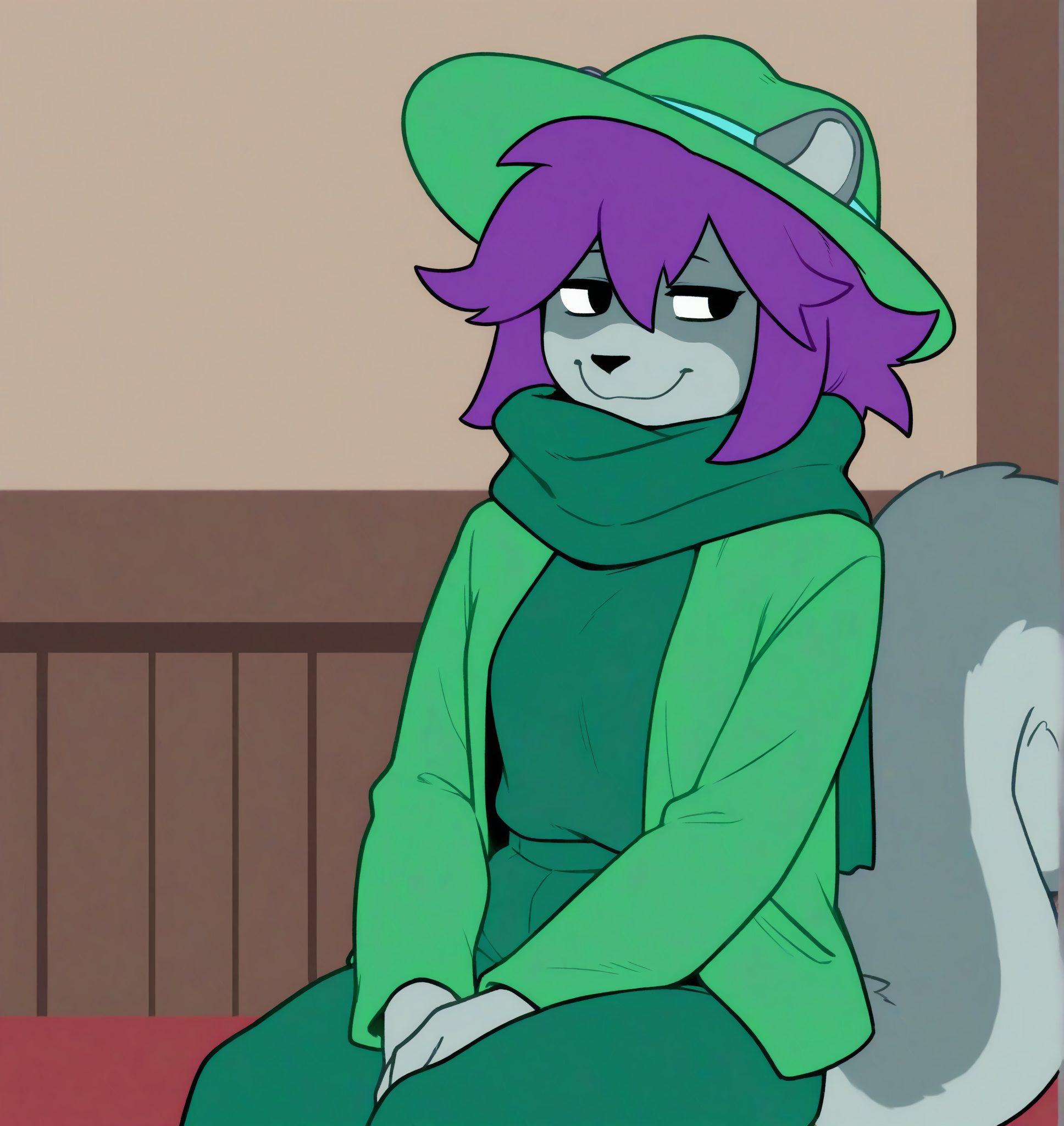 lora:Mooch_Undertale_Yellow:0.7, mooch (undertale yellow), grey squirrel, female, undertale, tree squirrel, undertale (series), anthro, purple hair, green hat, scarf, green scarf, neckerchief, clothed, clothing