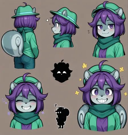 그녀의 주요 특징은 모자와 목스카프이며, 보라색 머리카락과 녹색 옷과 함께 프롬프트로 지정할 수 있습니다.