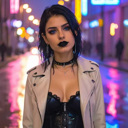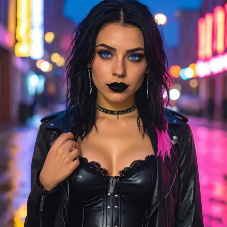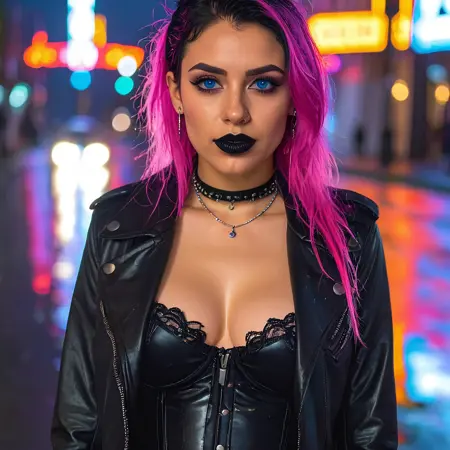 ukj goth babe, 아름답고 귀여운 고딕 라틴계 여성의 초현실적인 초상화, 젖은 검정색 머리카락에 미세한 분홍색 스트라이프, 사파이어 파란 눈, 광택 있는 검은 립스틱, 은색 피어싱, 레이스 코르셋 위의 검은 가죽 재킷, 밤에 비가 오는 네온 조명 거리에 서 있음, 젖은 도로에 반사된 빛, 시네마틱 HDR 조명, 초선명 디테일, 분위기 있는 사이버 고딕 분위기, 85mm 렌즈로 촬영