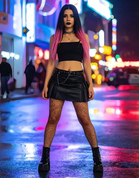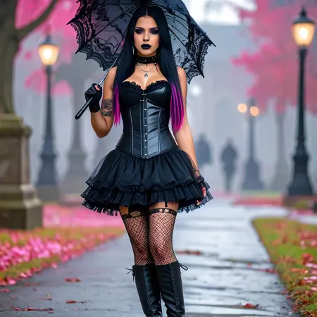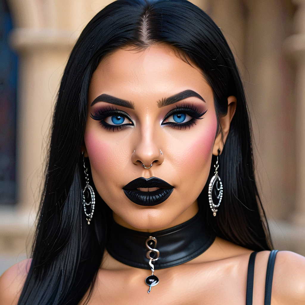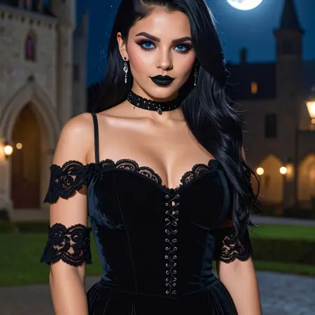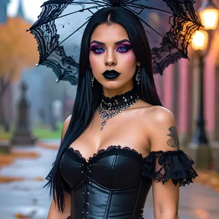 라틴계 GothBabe XL는 초현실적인 고딕 미녀로, 날카로운 대안적인 분위기와 우아한 어두운 패션을 융합한 것입니다. 분위기 있는 초상화, 사이버 고딕 거리, 신비로운 풀바디 촬영에 완벽하게 어울립니다.