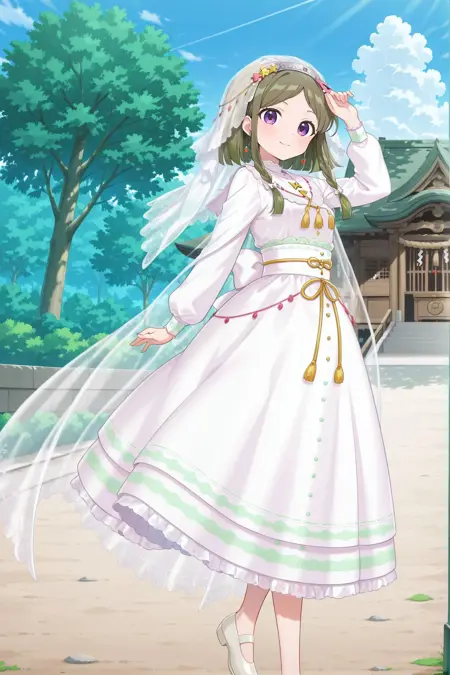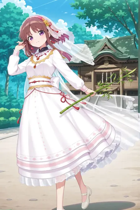 nishida satono, 1girl, solo, purple eyes, brown hair, short hair with long locks,, nishida satono \(white ginger nishita-douji\), alternate costume, bridal veil, hair ornament, pink hairband, earrings, see-through cape, necklace, pendant, white dress, wedding dress, long sleeves, white sash, gold trims, white skirt, white shoes,