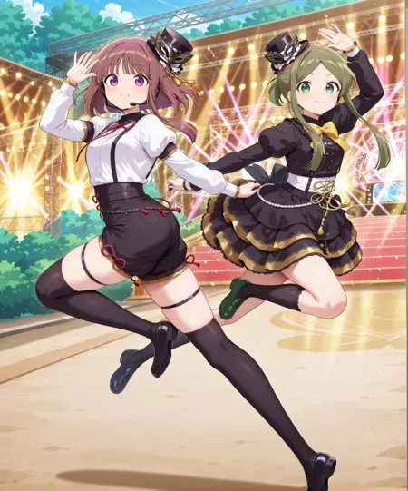 nishida satono, 1girl, solo, purple eyes, brown hair, short hair with long locks,, nishida satono \(the all-too-dark backup dancers\), alternate costume, alternate headwear, black hat, top hat, mask on hat, headset, red neck ribbon, white shirt, long sleeves, juliet sleeves, black suspenders, pearl belt, black shorts, black thighhighs, thigh strap, black shoes,