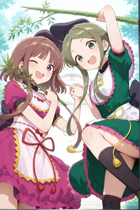 black hat, tate eboshi, green dress, puffy short sleeves, yellow bowtie, buttons, white apron, yellow ribbon, back bow, black bow, black socks, green shoes,