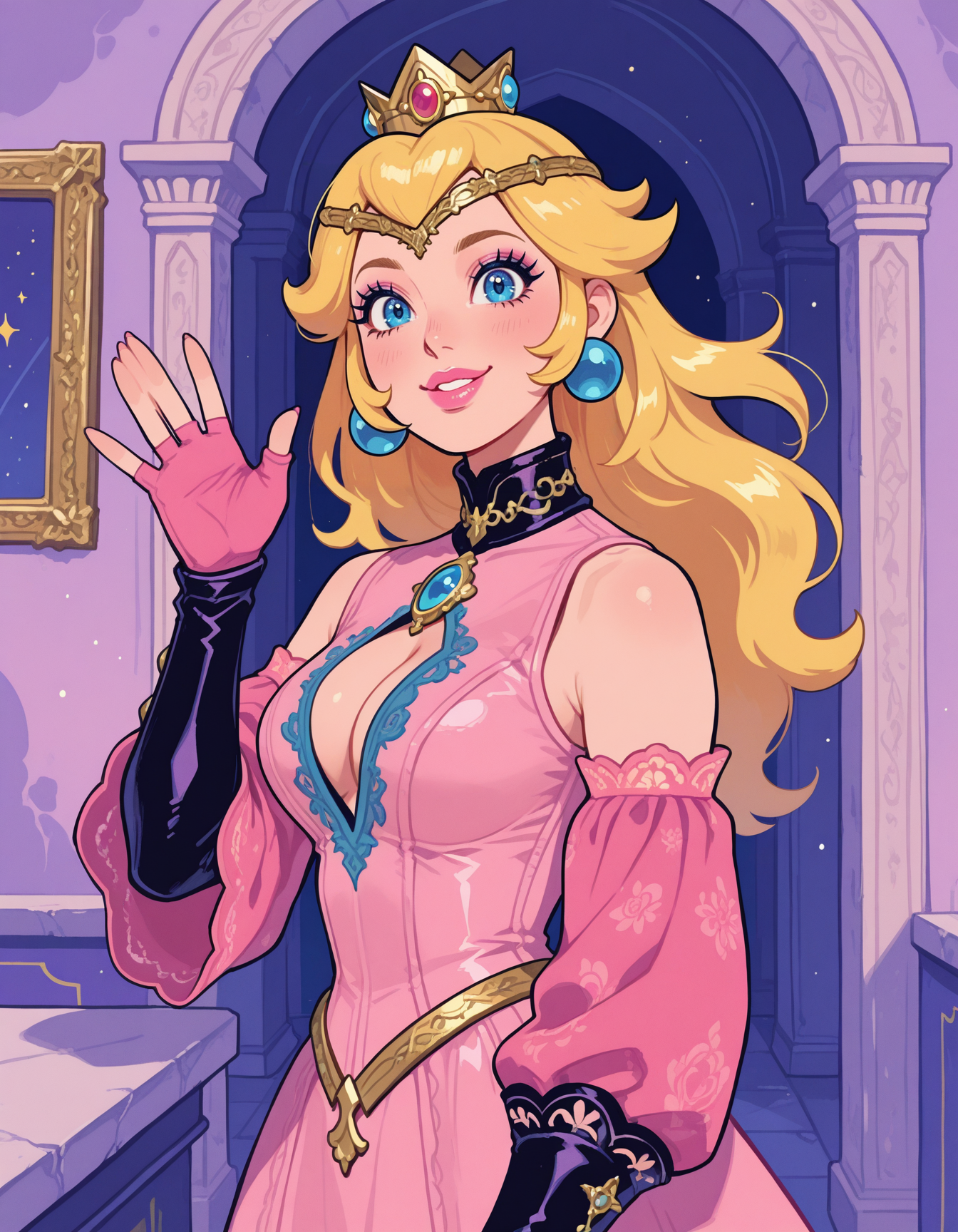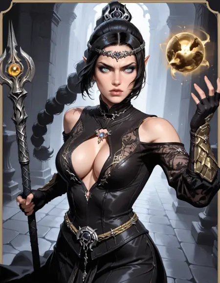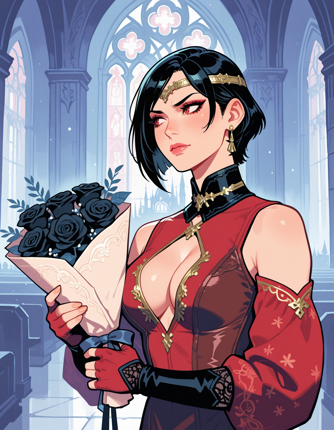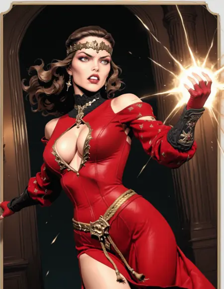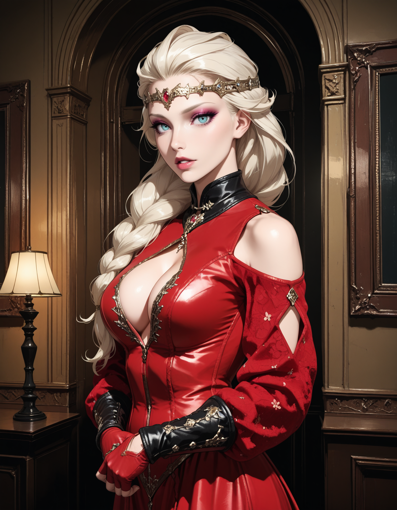 トレーニング済みの要素:赤いドレス、赤い手袋、赤い袖、輪飾り、レザーのドレス、フィット感のあるボディースーツ、高めの襟、ジュエリー、胸元の切り抜き、胸(ゴールド縁取りの深く落ち込む首元)、オフショルダー、黒い腕ガード、取り外し可能な袖、刺繍入りの袖、指なし手袋、ゴールドのベルト、ロープベルト