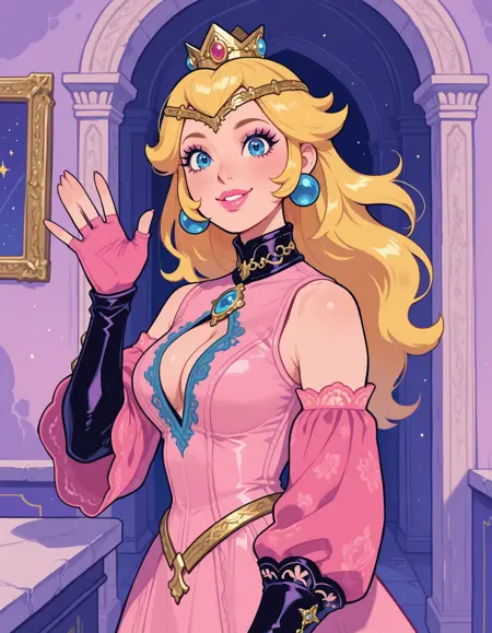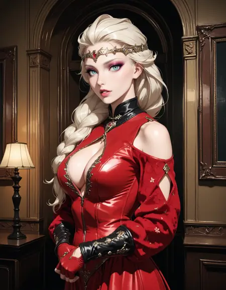 학습된 내용: 빨간 드레스, 빨간 장갑, 빨간 소매, 원형 헤드기어, 가죽 드레스, 몸에 꼭 맞는 상의, 높은 칼라, 보석, 절개 컷아웃, 가슴(금장식으로 단정한 깊은 네클라인), 어깨 드러냄, 검은 팔보호대, 분리형 소매, 자수가 있는 소매, 손가락 없는 장갑, 금색 벨트, 로프 벨트