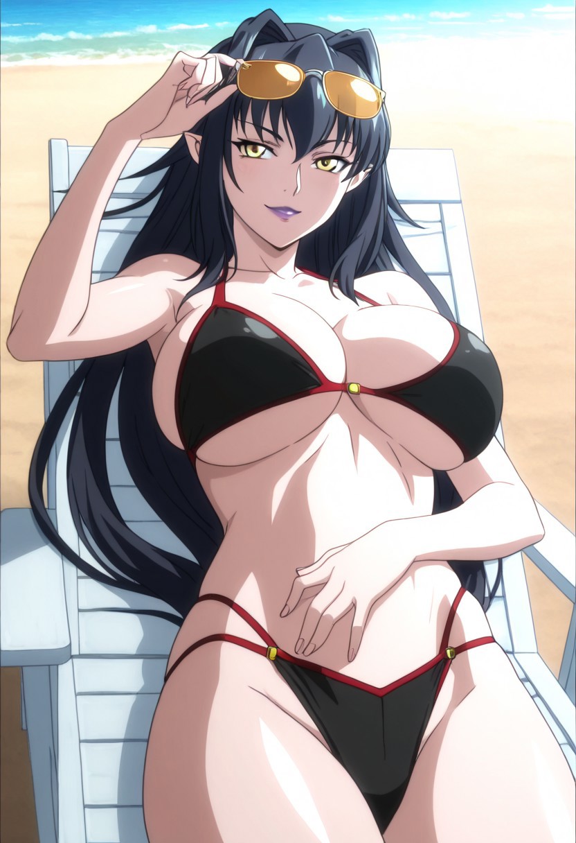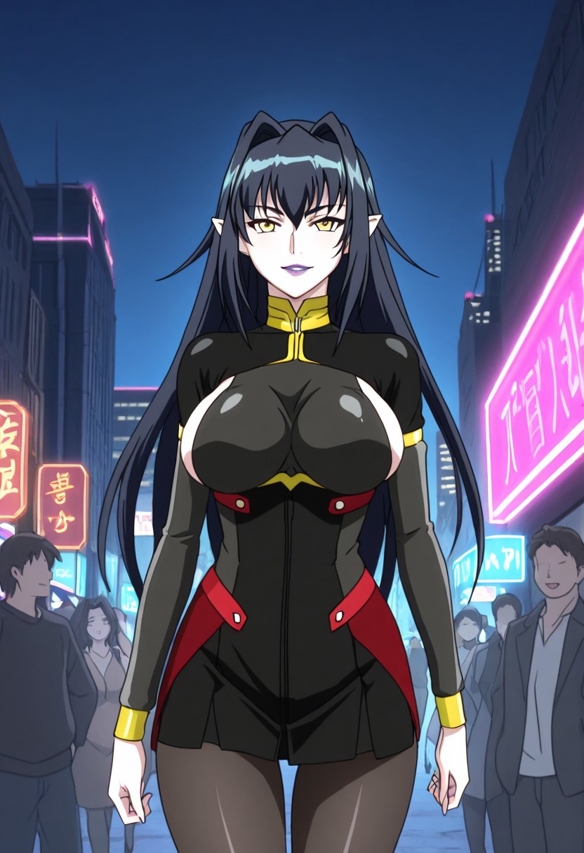 성숙한 여성, 긴 머리, 검은 머리, 큰 가슴, 노란 눈, 머리카락이 얼굴을 감싸다, 립스틱, 메이크업, 뾰족한 귀, 보라색 입술,