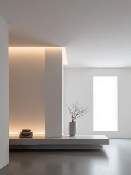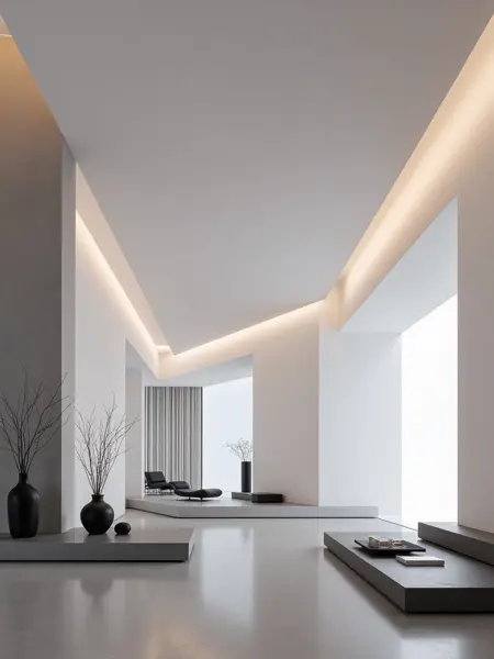 미니멀리스트이자 중성 톤의 인테리어 디자인, 높은 천장, 매끈한 벽, 선형 조명 스트립, 저 프로파일 가구, 미니멀리스트 화병.
