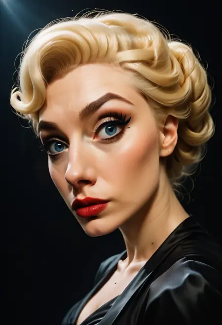 모델을 학습시켜 "편안하지 않을 정도로 가까운" 캐릭터를 생성하게 합니다. 눈을 휘둥그렇게 뜬 👁️👄👁️, 머리를 기울인 🤔, 얼굴이 화면의 대부분을 차지하며, 약간의 이상함 🎪을 품은 모습입니다.