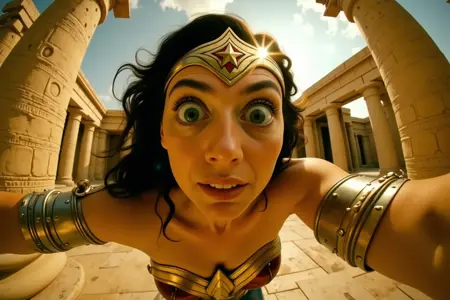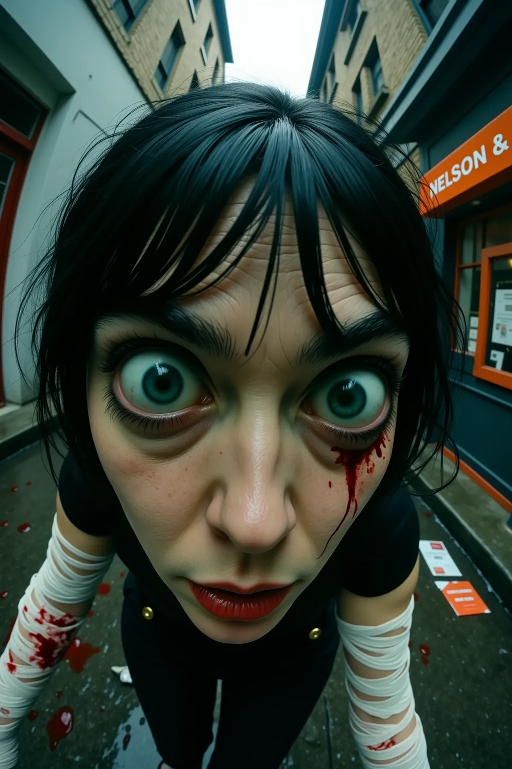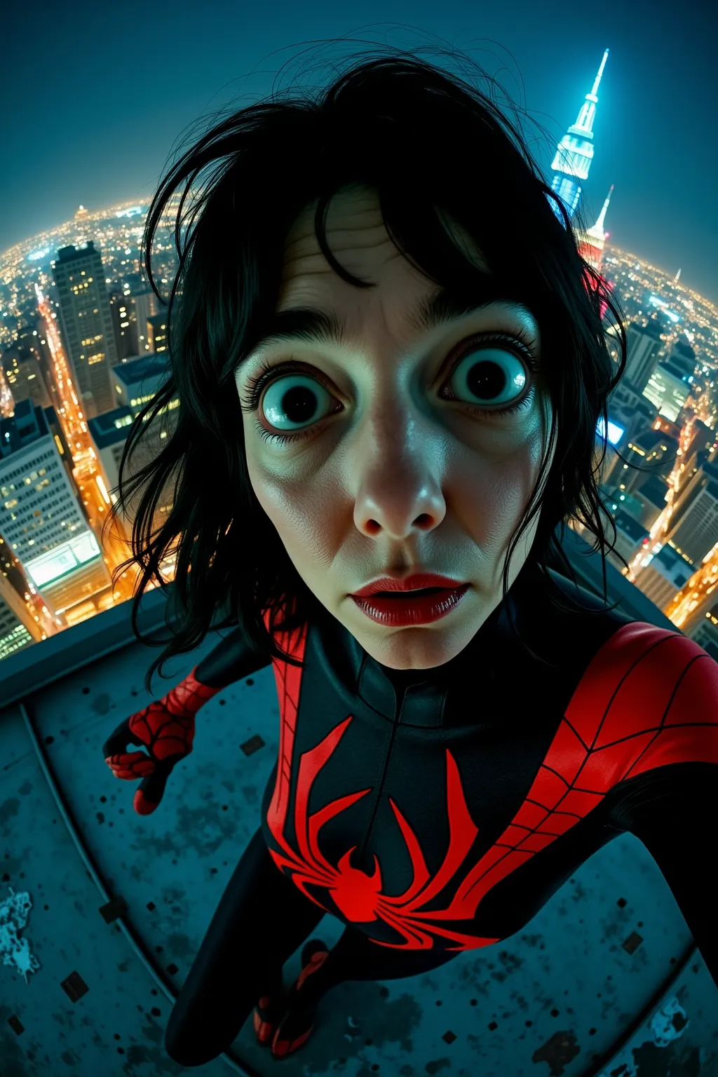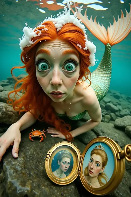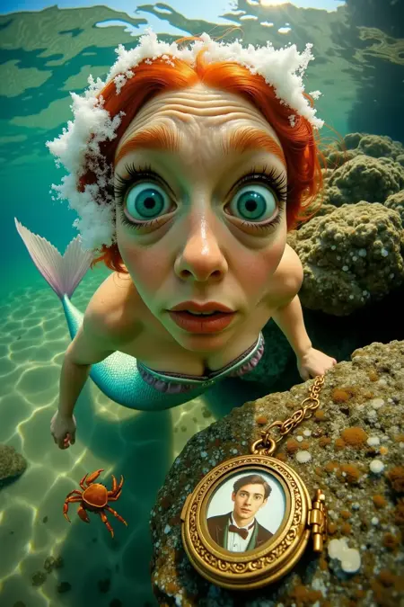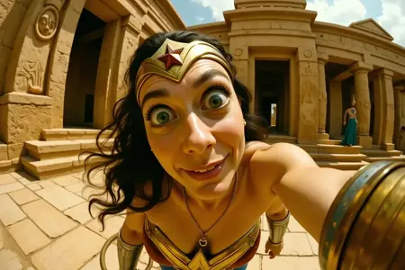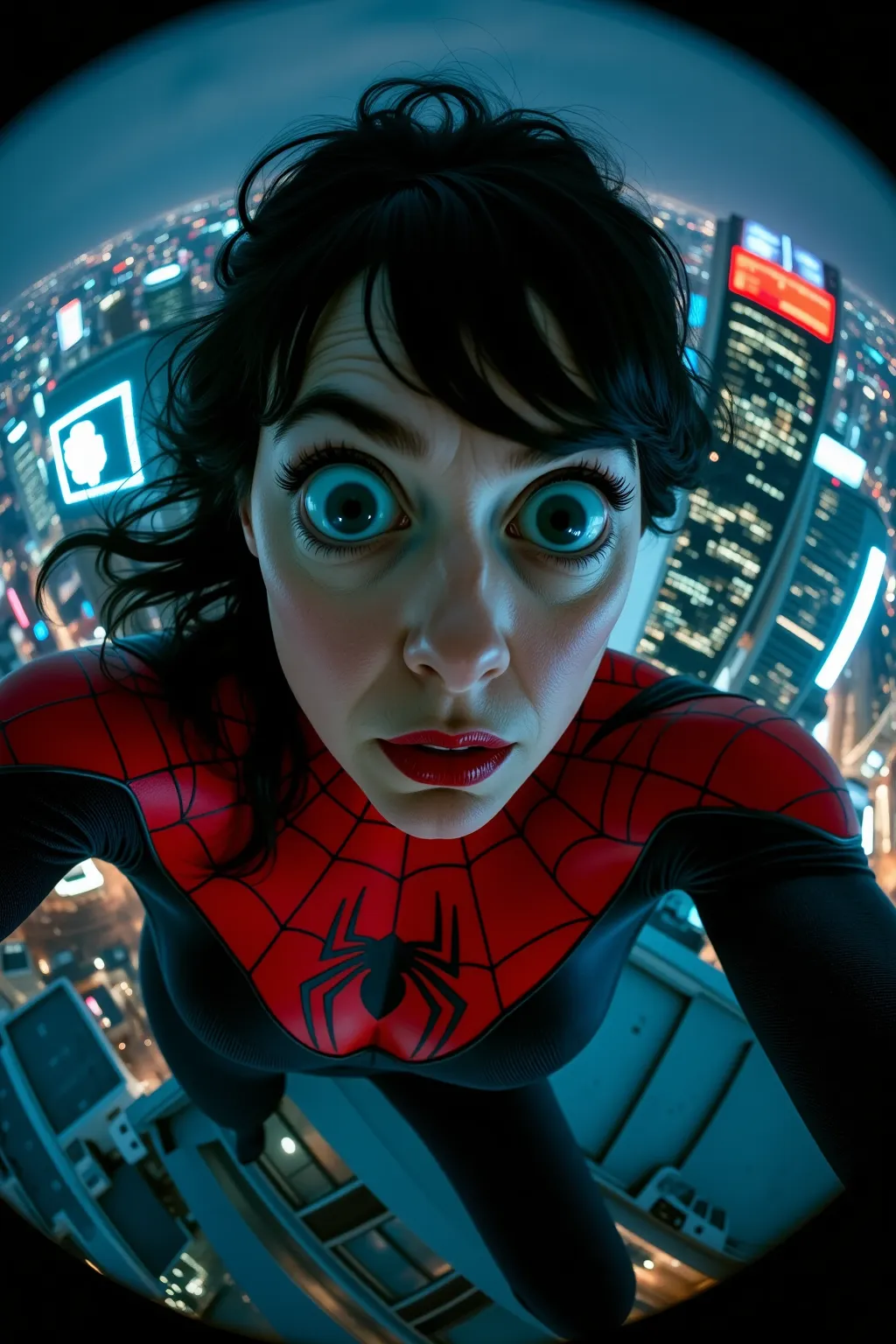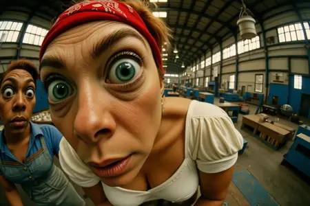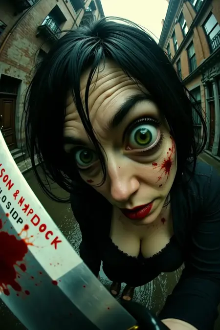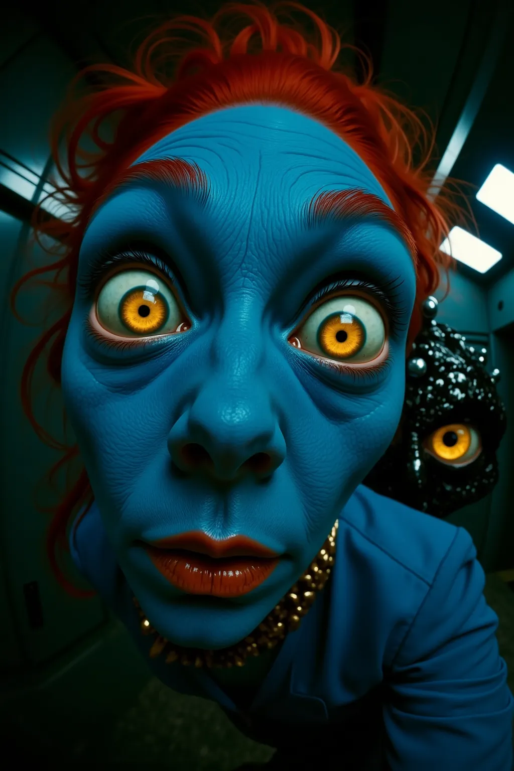 2️⃣ "A curious, πŸ‘΅ old woman smiling with too many teeth 🦷, her knuckles gripping the edge of the shot. Extremely sharp focus, slight fisheye lens. And a bit weird."