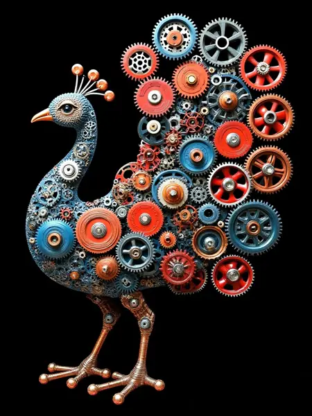기계 기어로 구성된, 기어로 이루어진 공작새를 제작하세요. 꼬리와 몸체를 기어로 만들고, “눈” 부분에는 화려한 금속 색상을 적용하세요.