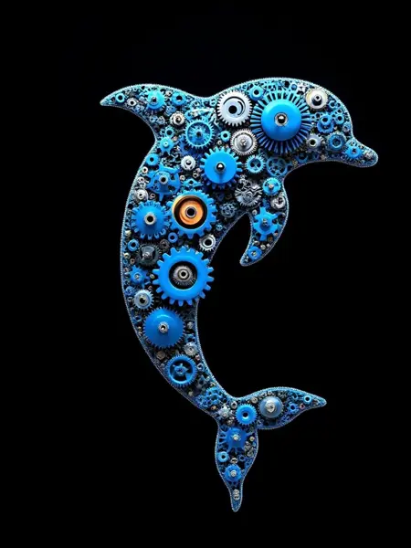 기계 기어로 구성된, 기어로 이루어진 돌고래를 제작하세요. 기어로 유선형 몸체와 지느러미를 형성하고, 기어로 가득 찬 수중 공간에 배치하세요.