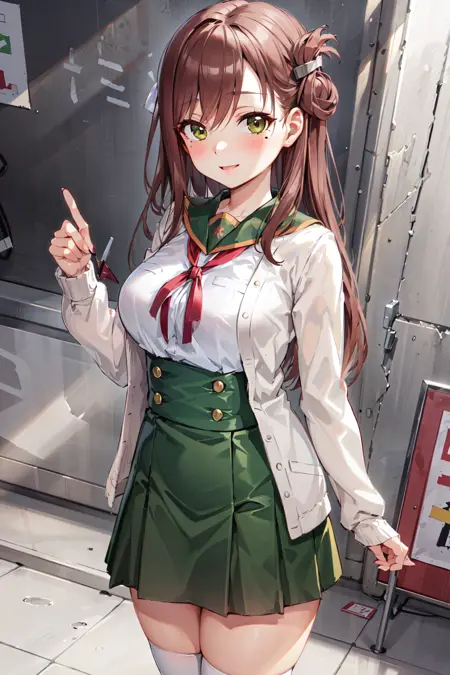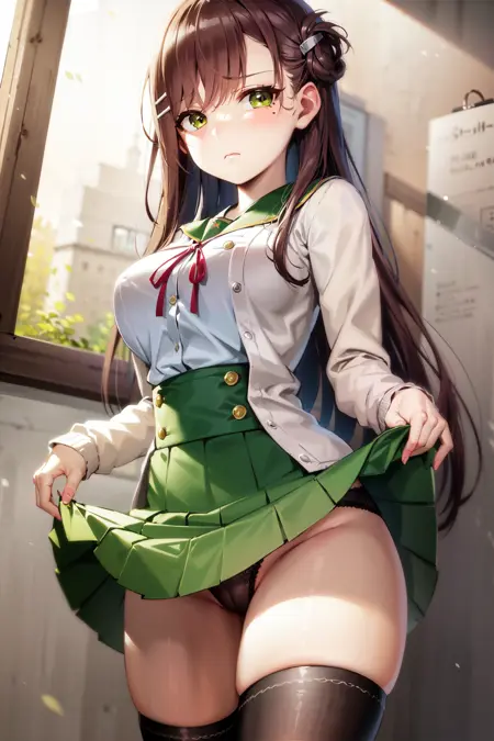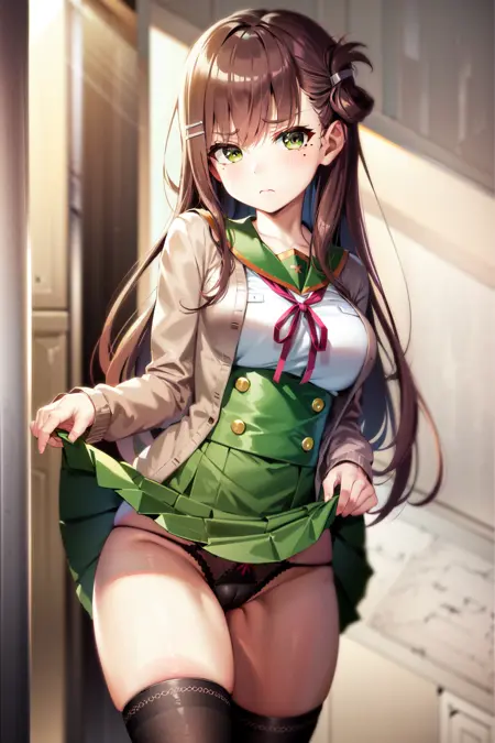1girl, wakasa yuuri, long hair, school uniform, solo, folded hair, brown hair, mole under eye, skirt, cardigan, black thighhighs, hair ornament, green eyes, hairclip, large breasts