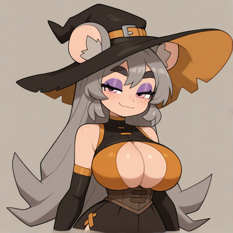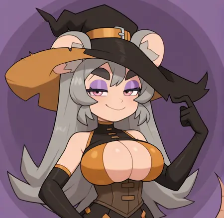 장갑, 모자, 가슴 노출, 어깨 노출, 분리된 소매, 팔꿈치 장갑, 의류 컷아웃, 검정 머리장식, 메이크업, 마녀 모자, 가슴 컷아웃, 코르셋, 머리장식을 통한 귀, 모자 벨트, 드레스, 검정 장갑,