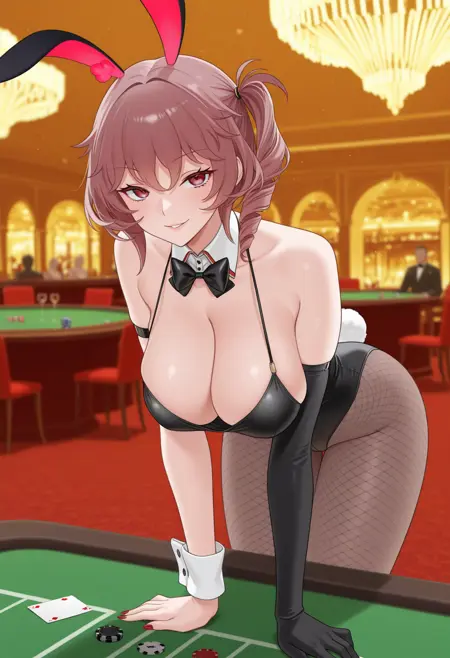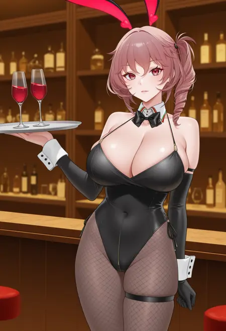 비공식 토끼소녀 (불안정함, 장갑을 잘못된 팔에 착용함): 두카 델리 아브루치 (아주르 레인), Duca_bunnygirl, 옆쪽 드릴 헤어, 옆쪽 펜테일, 검은 레오파드, 분리된 색상, 분리된 팔목, 분홍색 머리, 한쪽 팔장갑, 피쉬넷