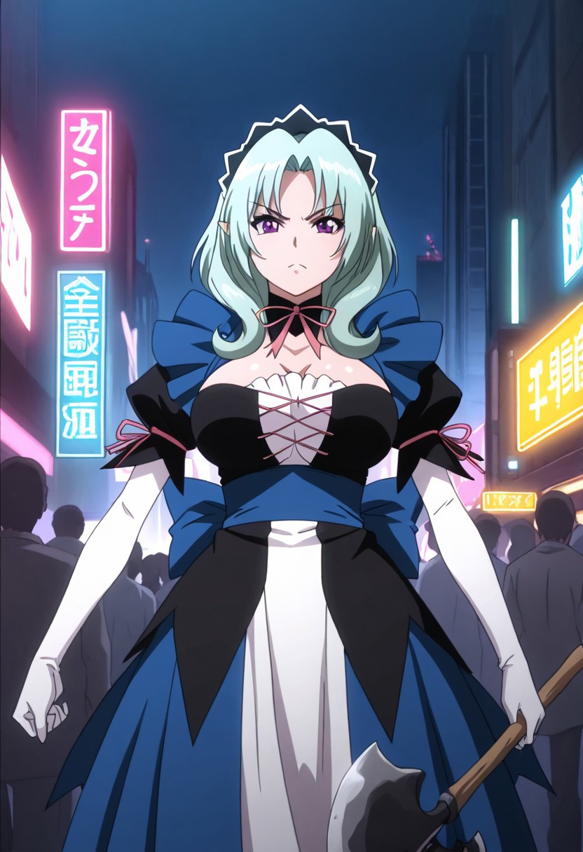 청록색 머리카락, 긴 머리카락, 보라색 눈, 뾰족한 귀,