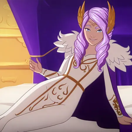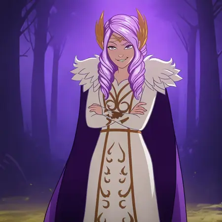 Skyra, long hair, dual braids, purple hair, gold tiara, tiara on forehead, gold feathered themed crown,