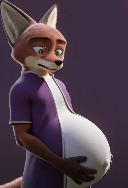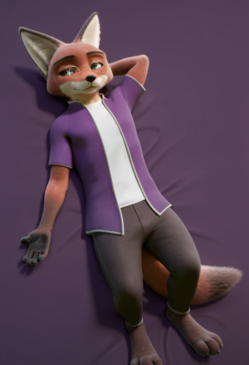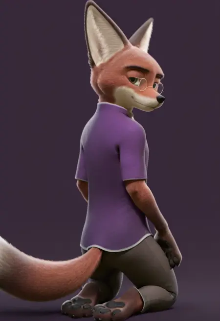 foxtomas, purple shirt, undershirt, khakis, round glasses, solo, bushy tail, dual tone fur, 1boy