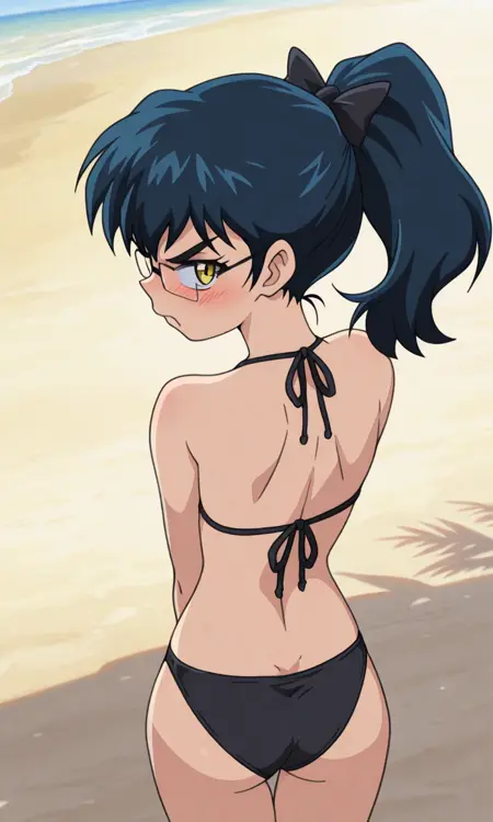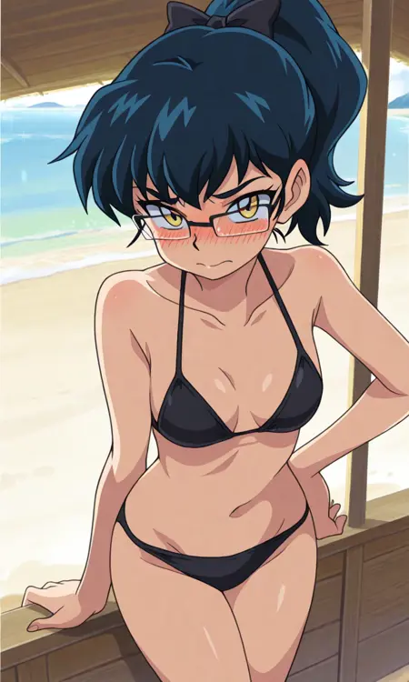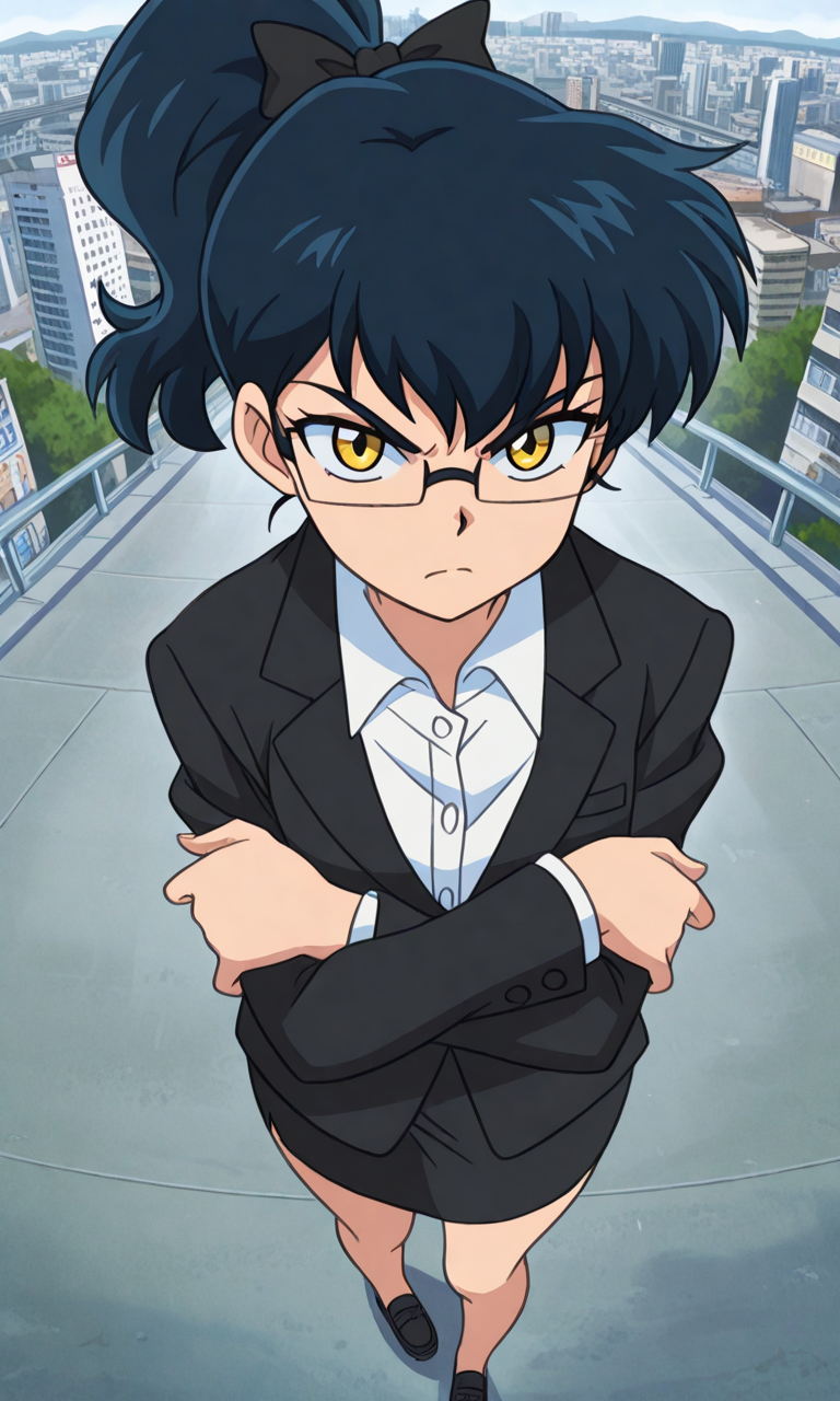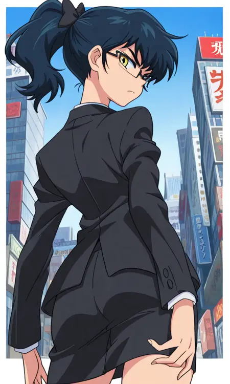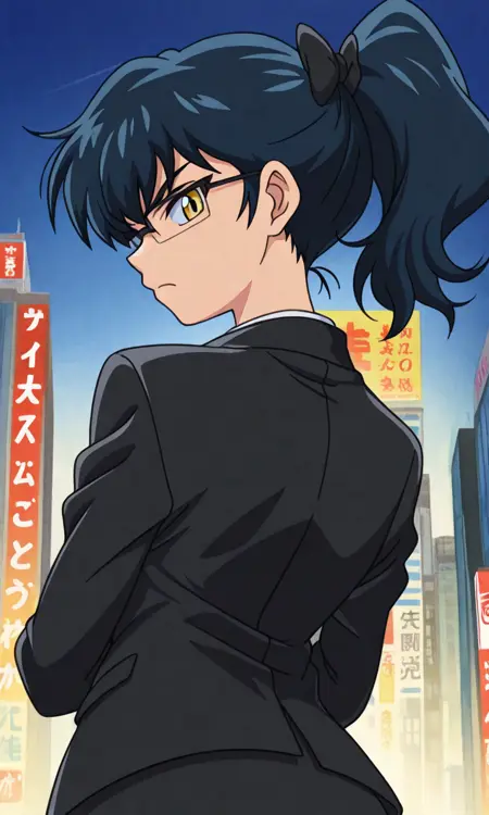AkiNat, 1girl, dark blue hair, yellow eyes, glasses, rectangular eyewear, ponytail, black hair bow