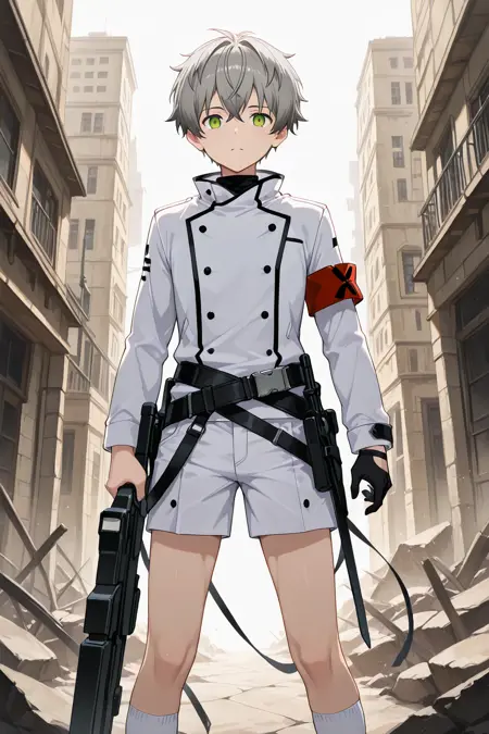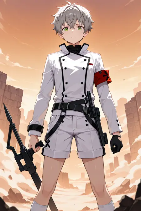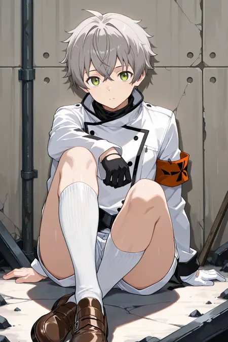 mephisto, armband, white_jacket, grey_hair, green_eyes, white_shorts, kneehighs, white_socks, single_half_glove, brown_footwear,