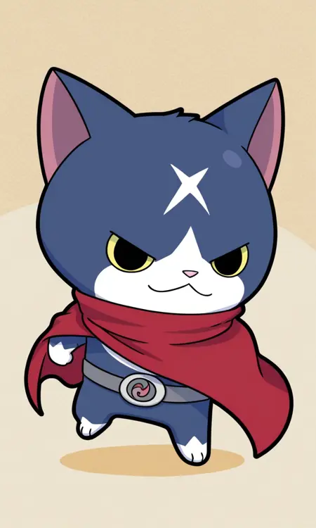 solo, male, anthro cat, chibi, dark-blue fur, white face, pink nose, white scar on forehead, short tail, white hands, white paws, red cape, gray belt with white brooch