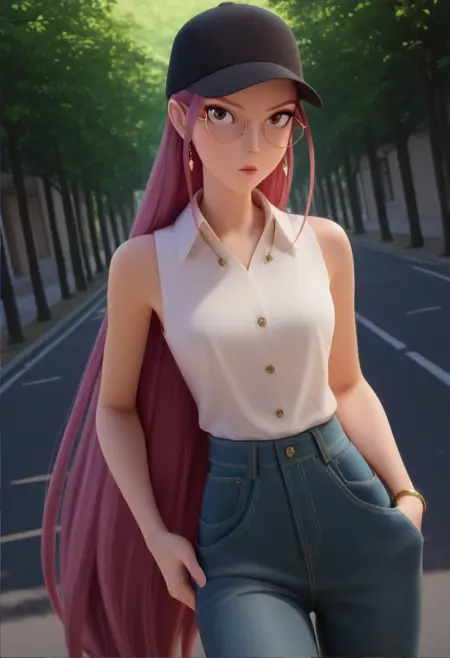 casual,white shirt,collared shirt,sleeveless shirt,buttons,pants,denim,hat,baseball cap,glasses,round eyewear,black headwear,