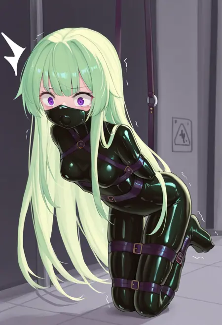 ヘルパープロンプト: ラテックス縛り、鼻の上、口なし、頭部カバー、髪の毛カバー、ホグタイ、粘着性、スライム、窮地縛り