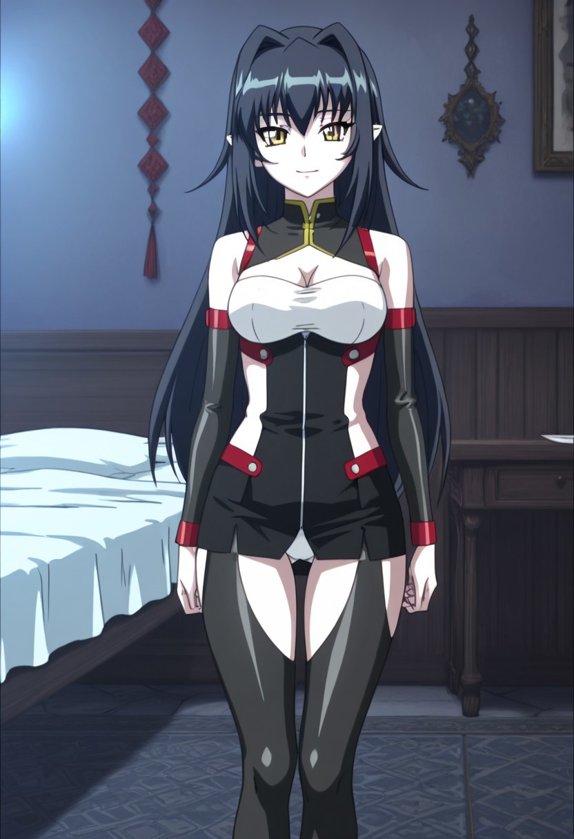 흰색 크롭탑, 가슴 사이 노출, 터틀넥, 분리형 소매, 라텍스 소매, 검은 소매, 어깨 노출, 긴 소매, 짧은 드레스, 측면 슬릿, 라텍스 레깅스, 흰색 팬티, 허벅지까지 긴 양말,