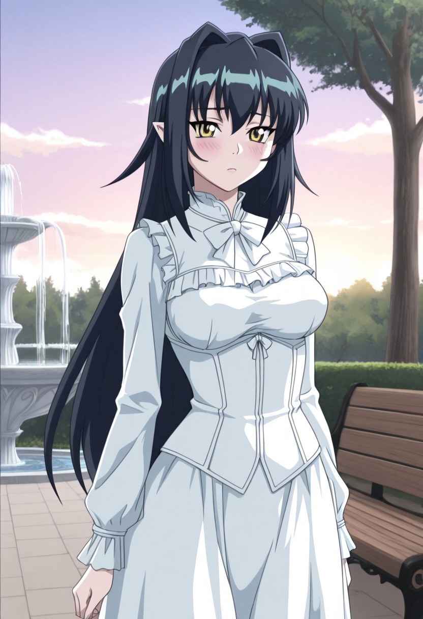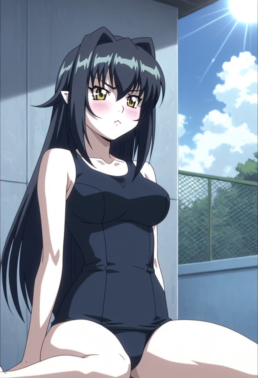 노란 눈, 츠리메 눈, 중간 크기 가슴, 긴 머리, 검은 머리, 머리카락이 눈을 가림, 눈 사이의 머리카락, 뾰족한 귀,