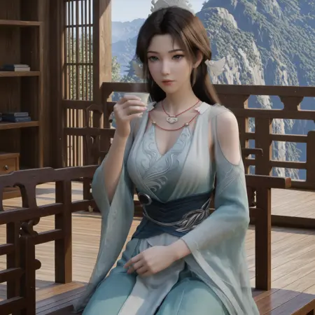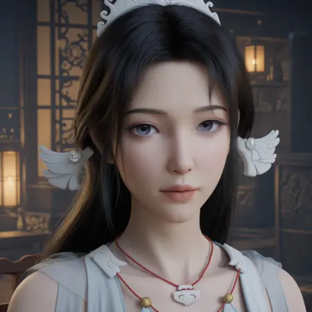songyu, 1girl, solo, black hair, long hair, blue eyes, necklace, jewelry, chinese clothes, dress, hair ornament, white dress,