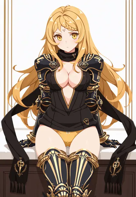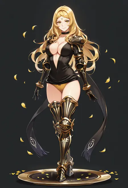 scarf, choker, black dress, cleavage, gauntlets, yellow panties, armored boots,