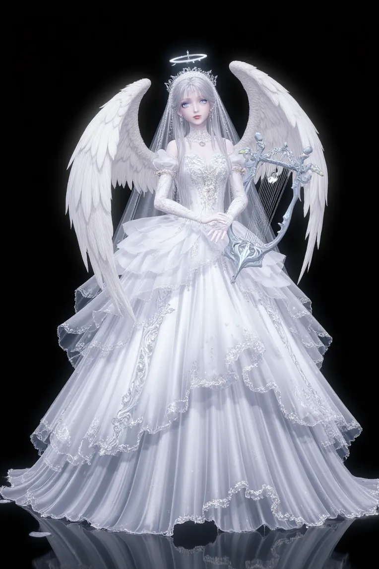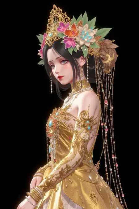 这是一幅高度精细的数字艺术作品,描绘了 Synn——一位超凡脱俗的天使形象,拥有飘逸修长的黑色长发和巨大的深色羽翼。Synn 身着奢华繁复的长裙,裙身闪烁着精致的纹样与金色点缀,营造出天界般的视觉效果。她头戴纤细的金色头饰蒙住双眼,一手托着发光的金色球体。背景为柔和模糊的白色,突出中心构图的 Synn,遵循三分法原则。光线为人工照明,凸显长裙的光泽质感与球体的反光效果。整体风格融合幻想与超现实主义,拥有极深的景深,强化了 Synn 神圣的存在感。