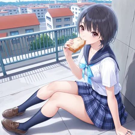 shirai hinako, jk suit, 彼女は茶色の目を持っている。短い黒髪である。口を閉じたまま恥ずかしがり屋である。セーラー服を着ている。白いシャツに青いセーラー衿と短い袖を着用している。チェック柄の青いプリーツミニスカートを履いている。茶色のローファーを履いている。青い膝上ソックスを着用している。青いボウタイを着けている。指輪を着けている。