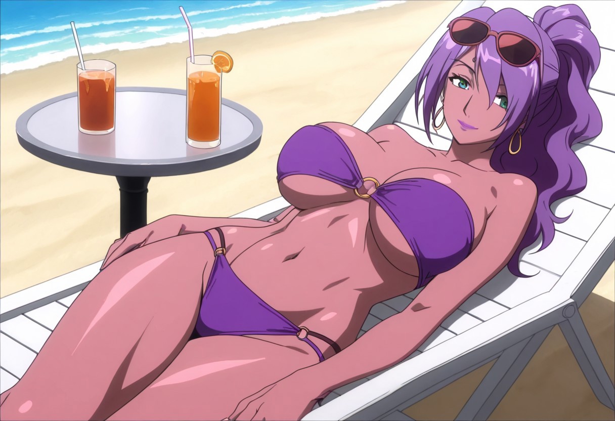 深色皮肤,紫色头发,头发垂在一侧眼睛上,绿色眼睛,妆容,马尾辫,口红,耳环,大乳房,